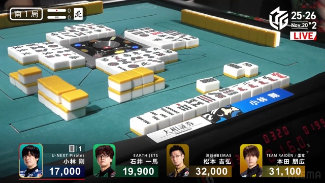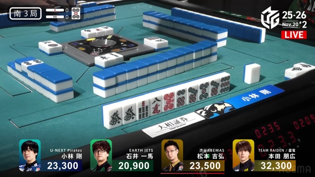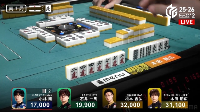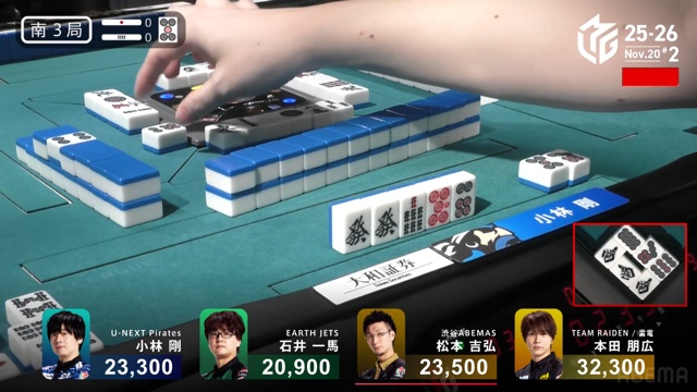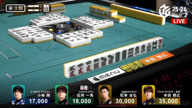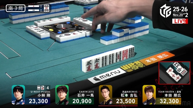 開けてびっくり、トップ目の本田から跳満の和了となった。