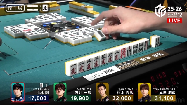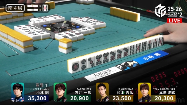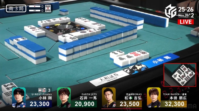 小林、トップ目の松本からリーチ・赤・裏7700の和了。
