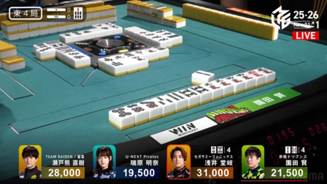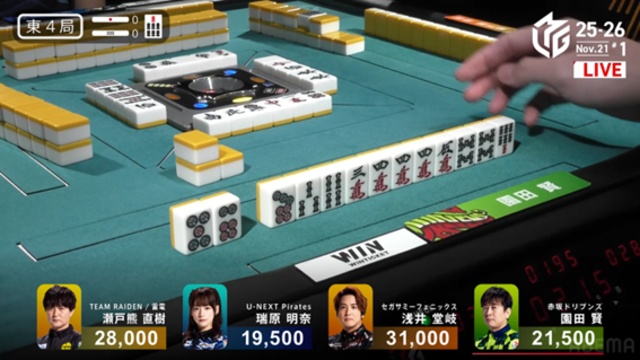 東4局。親番を迎えた園田。点棒状況は以下のようになっており、どの選手も抜け出すきっかけを探している。