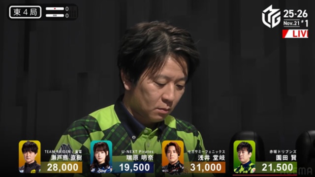 まずは、南2局1本場。2500点持ちのラス目に沈んでいた瑞原が、起死回生の6000は6100オールを決め、3着目に浮上する。