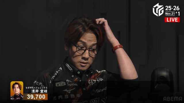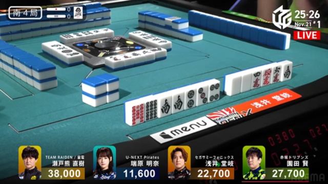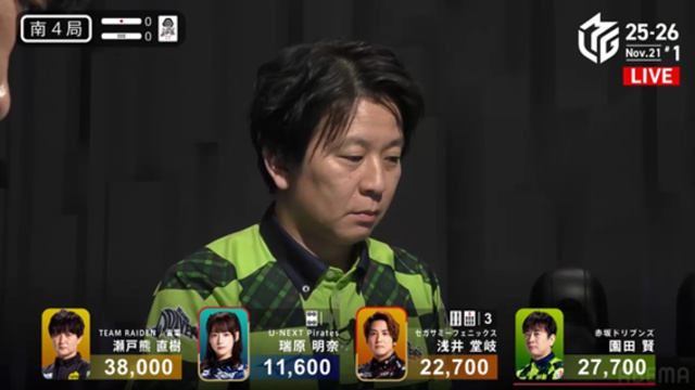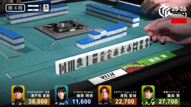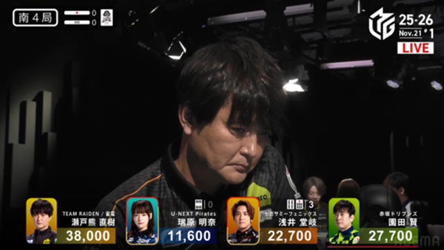 一方、3着目の堂岐は跳満ツモでもトップに届かない。まずは5000点上を行く園田をとらえて2着目に浮上することが第一目標だろう。同様に、満貫ツモでも着順アップが見込めないのが瑞原。点数の回復に専念する進行も想像できる。