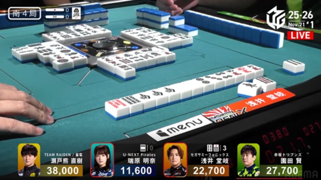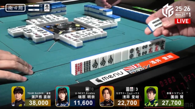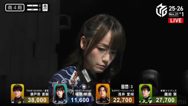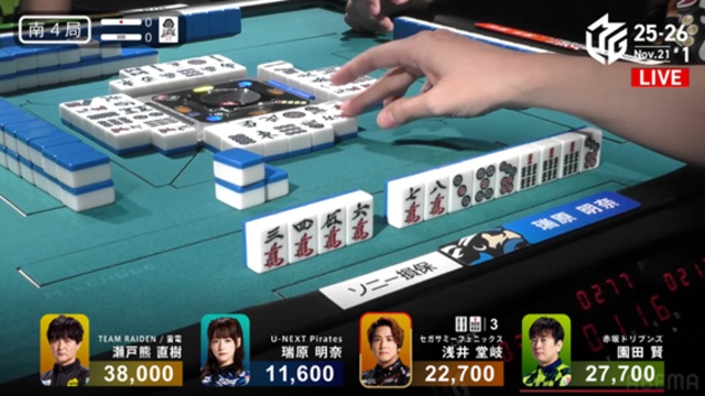 瑞原も追いかける。裏ドラ次第では堂岐から直撃で3着目への浮上も見込めるが、和了牌の