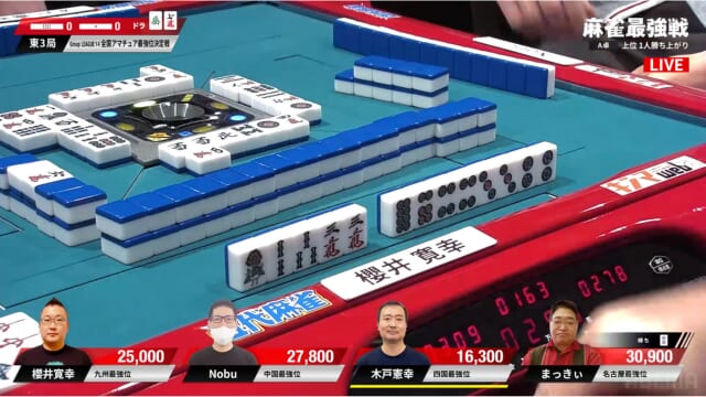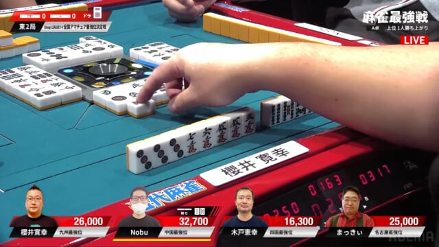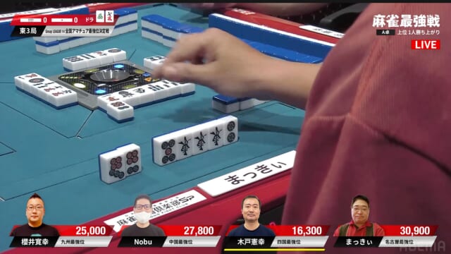この直後、櫻井も追っかけリーチ。一発勝負で勝ち上がるためには攻めていくしかない。
