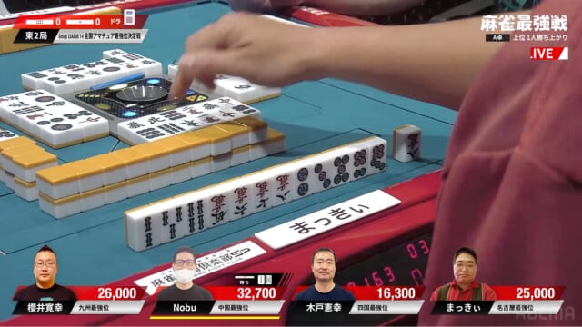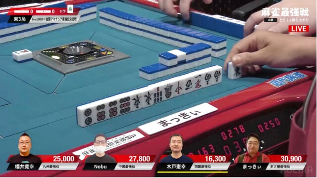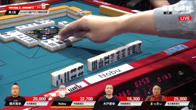 先制リーチをかけたのは、東1局1本場でトップに立った親番のNobu。
