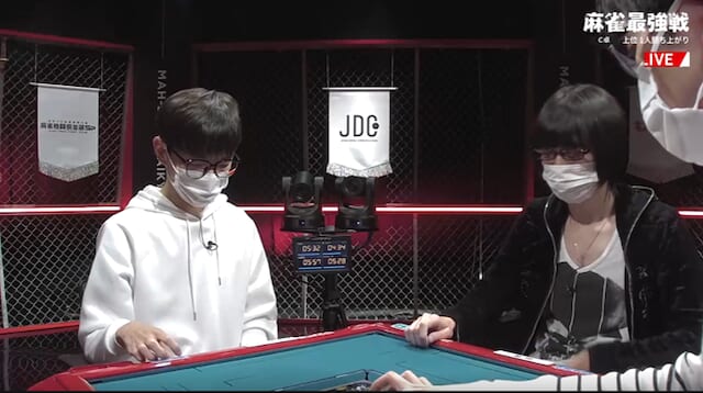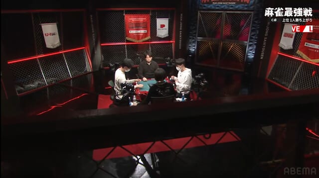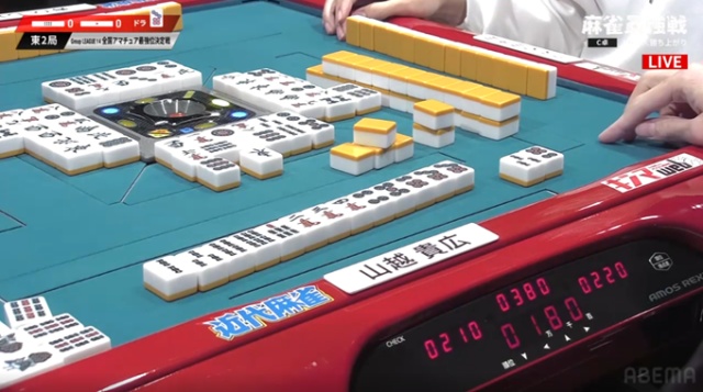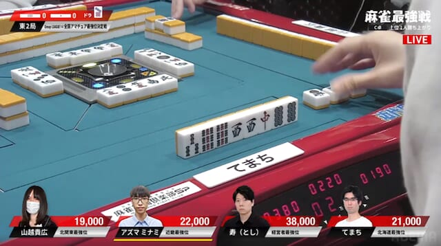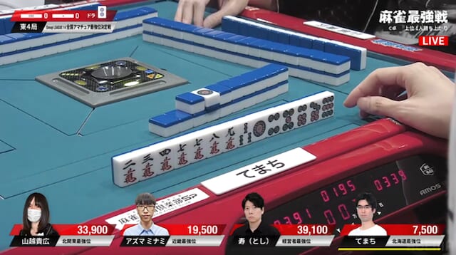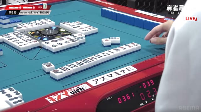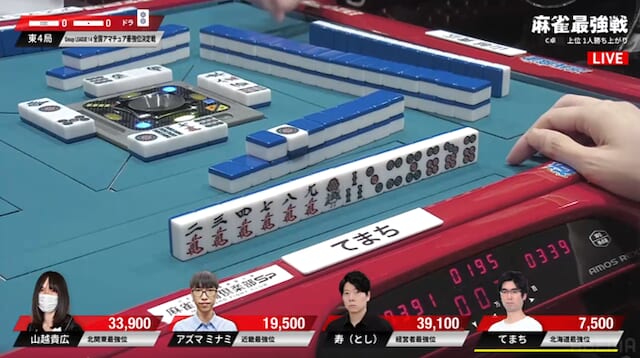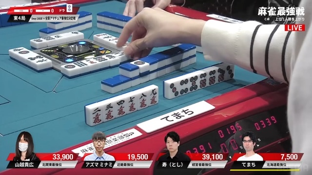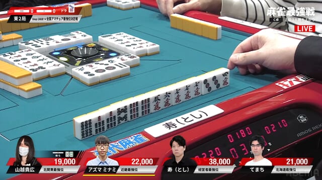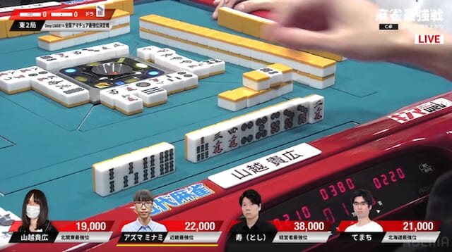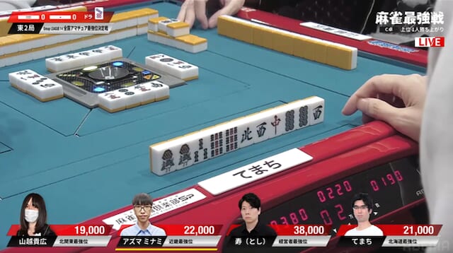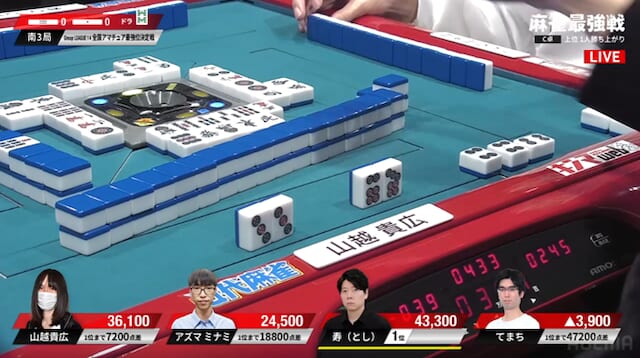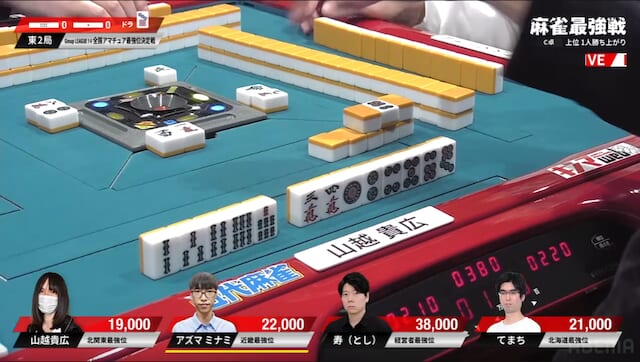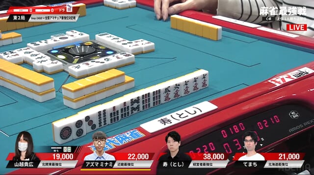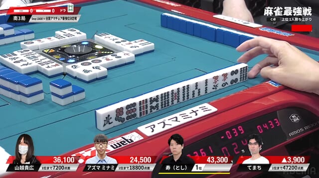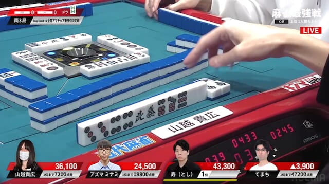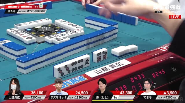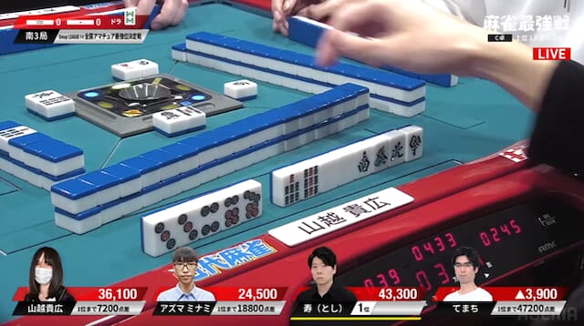 この局は山越とアズマミナミは、オーラスに向けて加点し、逆転条件を軽くするために激しくぶつかり合った。 アズマミナミは