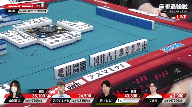 南場に入り、山越の2000オール、アズマミナミの2000-4000、てまちの700-1300とツモアガリが続き、迎えた南3局。てまちは依然として苦しい点数状況だが、オーラスの親番での連荘に望みをつなぐ。一方、オーラスは一撃で決める必要のある山越とアズマは、ここで確実に加点して条件を軽くしておきたい局面。特にアズマはトップ目の寿と18800点差。満貫、もしくは跳満ツモ条件を残すためにも、ここは勝負どころだ。