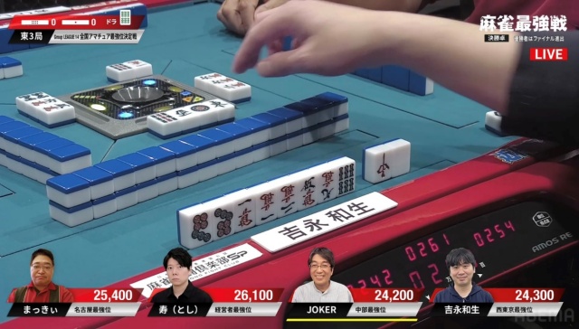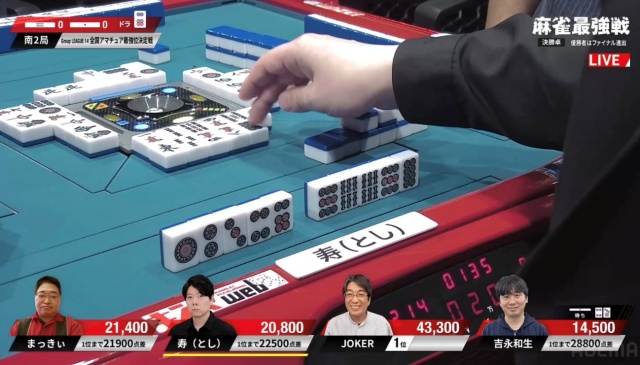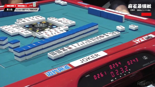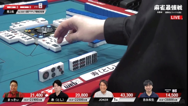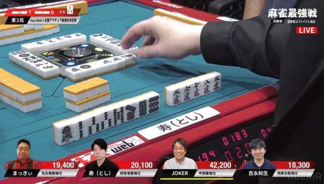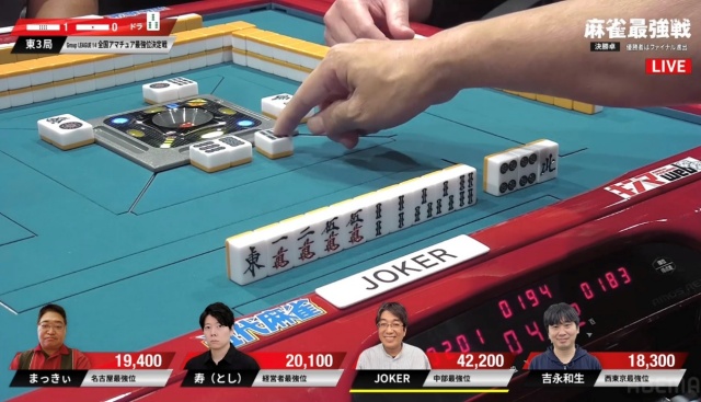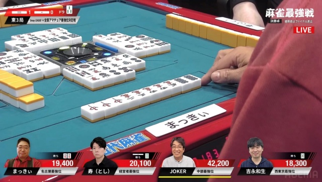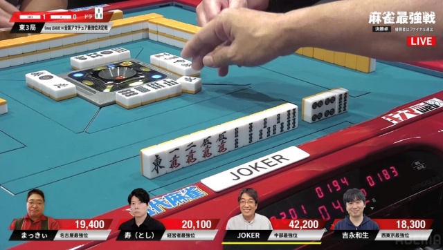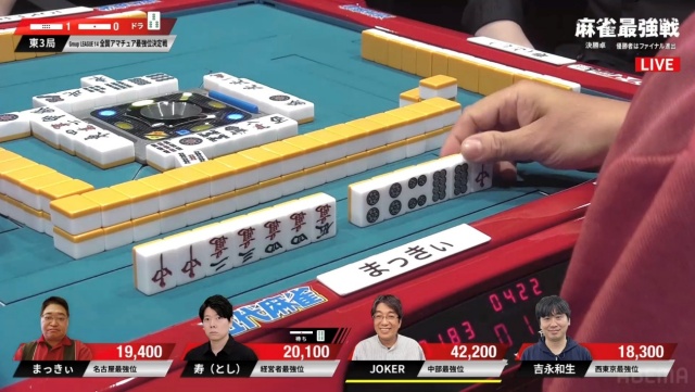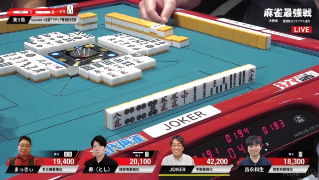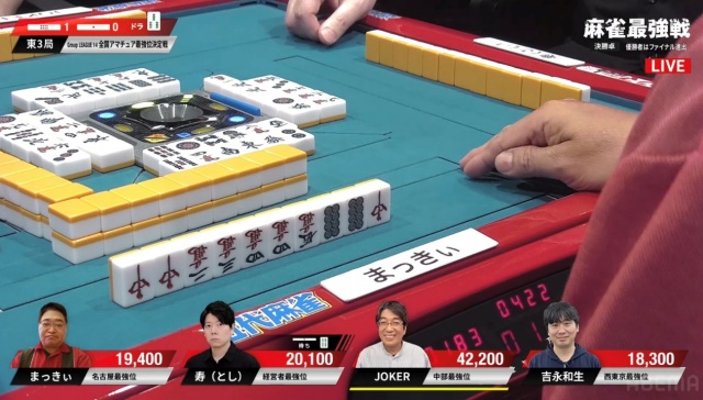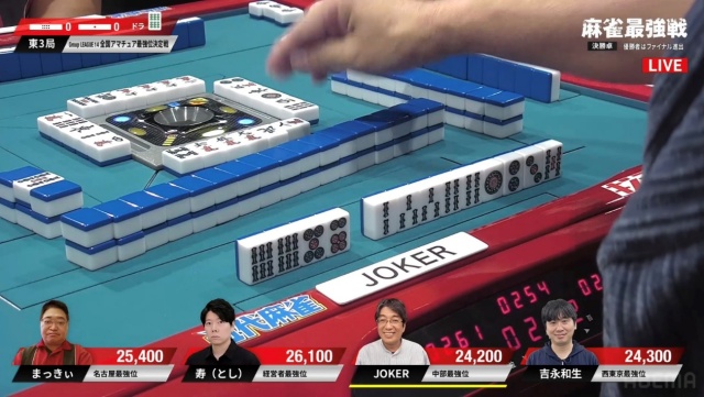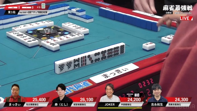 リーチ・ツモ・ピンフ・ドラ4の6,000オールでJOKERさんが頭一つ抜け出す格好となった。