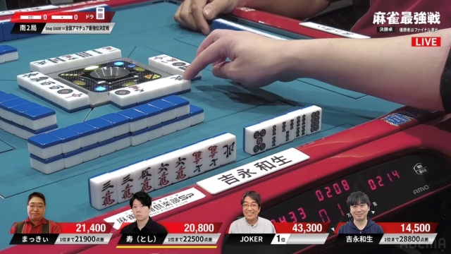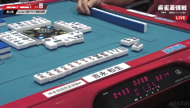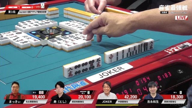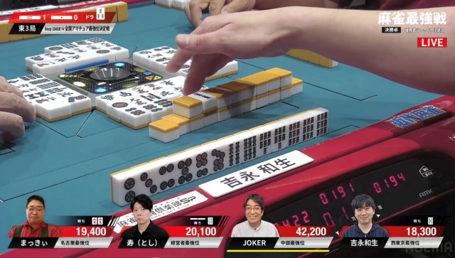 上手く当たり牌を止めてテンパイを取った吉永和生さんが、リーチの現物