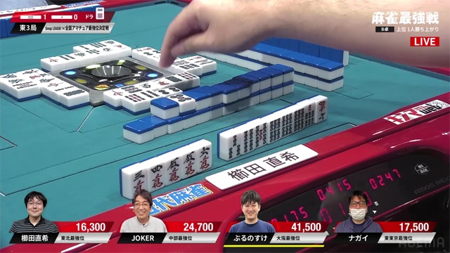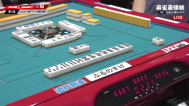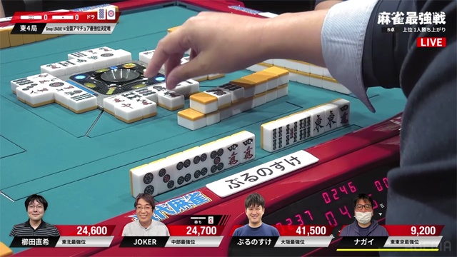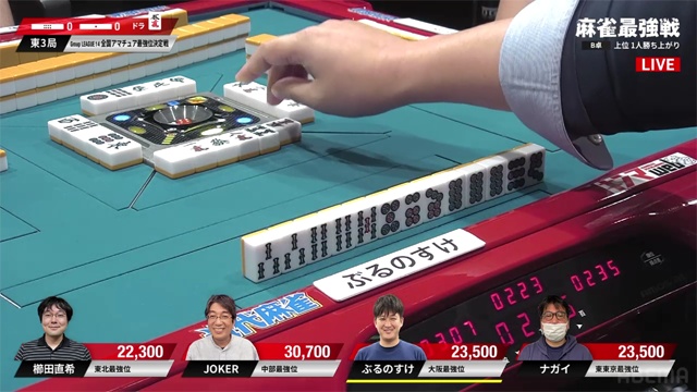 強烈な親の跳満ツモで、ぶるのすけがトップ目に立つ。
