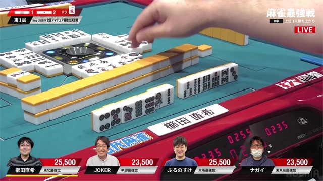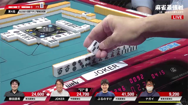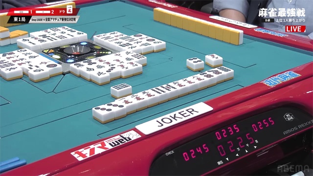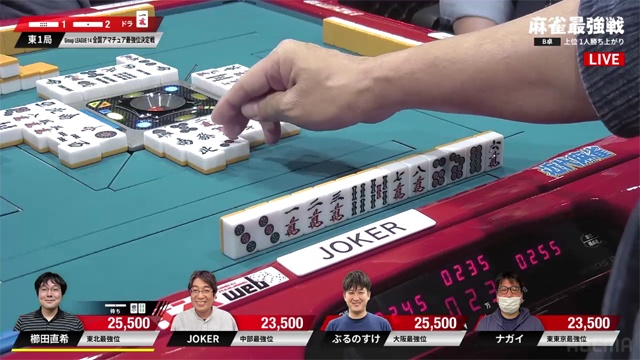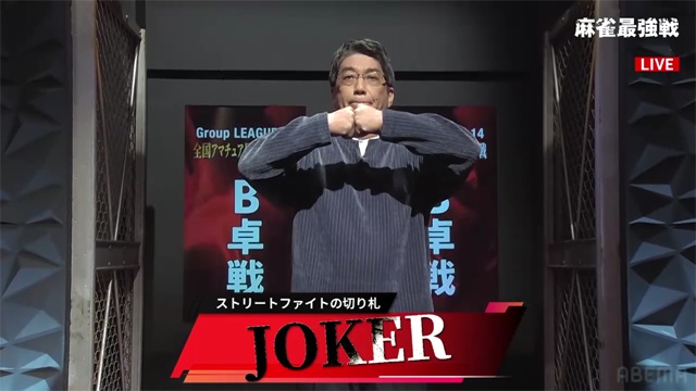 裏ドラは乗らなかったものの、リーチピンフドラ、3900は4200のアガリ。供託も入りまずはJOKERが頭ひとつ抜け出す。