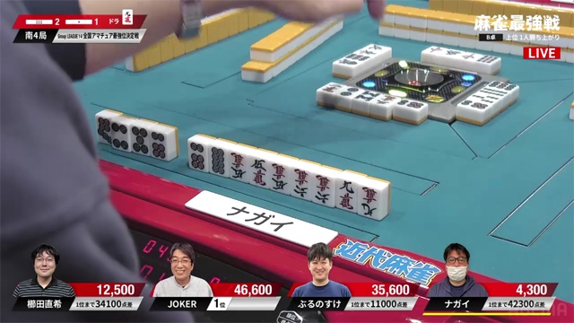リーチツモピンフ裏1、1300・2600のアガリで僅かにぶるのすけをかわし、JOKERがトップ目に立った。