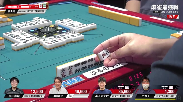 南2局、親番のJOKERはまたもや先制リーチを打つ。