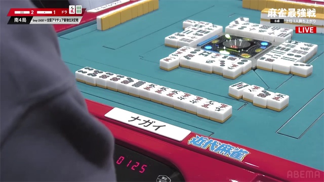 もつれにもつれた南4局4本場、またもナガイが先制リーチをかける。