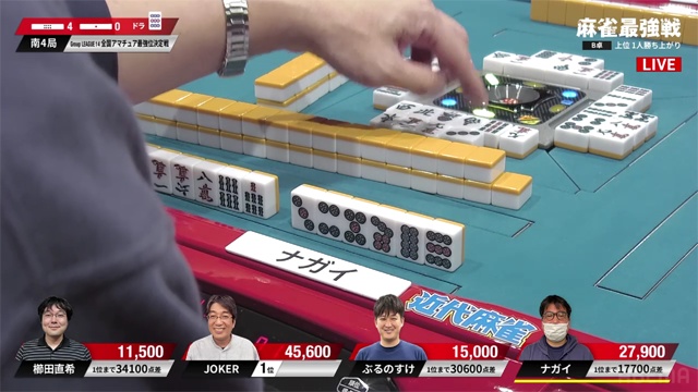 ナガイはリーチドラ3裏3、18600のアガリで2着目に浮上。