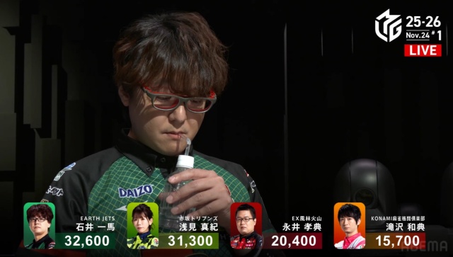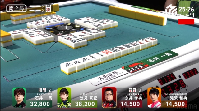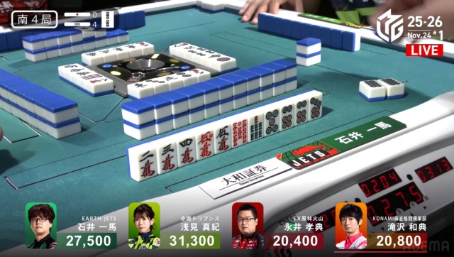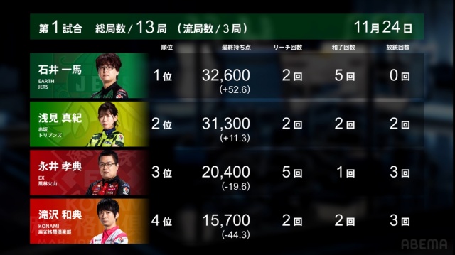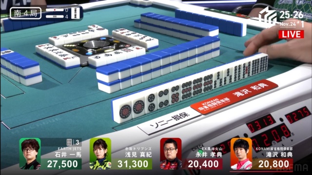 劣勢だった永井と滝沢が、1回ずつ4000オールをアガったことで、点差はぎゅっと縮まった。