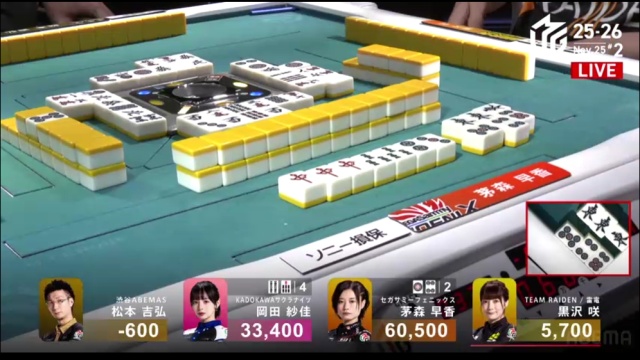 ・赤・ドラ=5800点。上と下がはっきりと分かれた。茅森、ついにトップ目に。