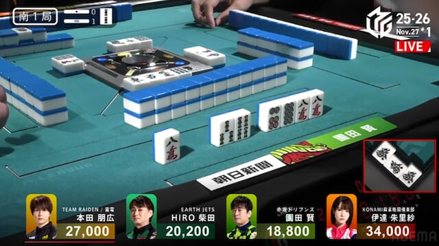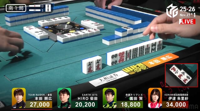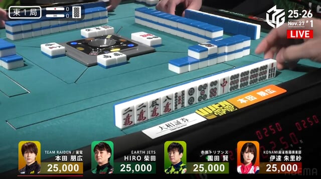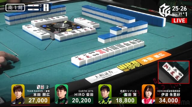 が放たれる。本田がこれを捉え、タンヤオ・赤の2900点のアガリ。 トップ目の伊達から直撃したことで600点差となる。