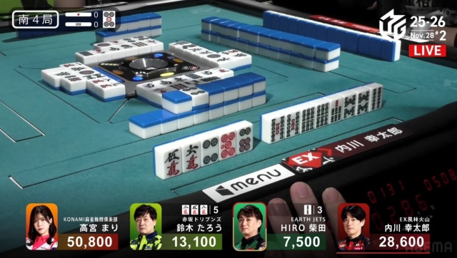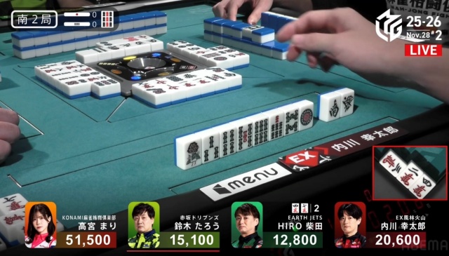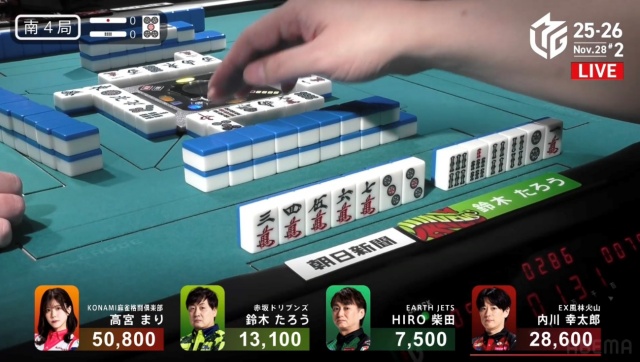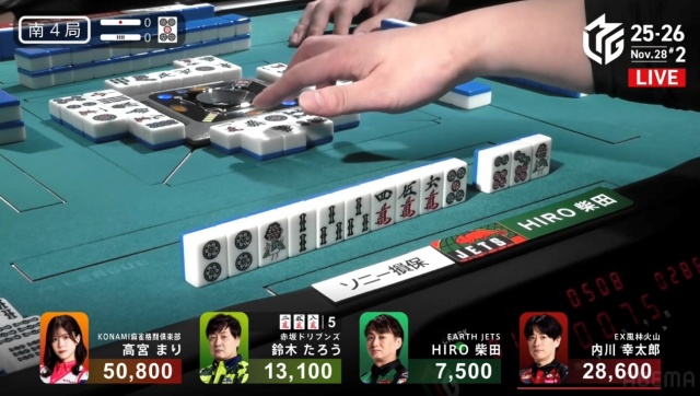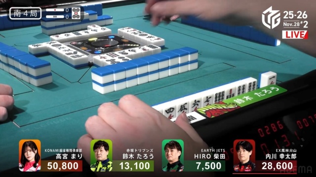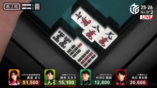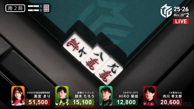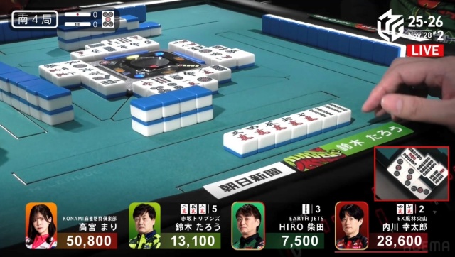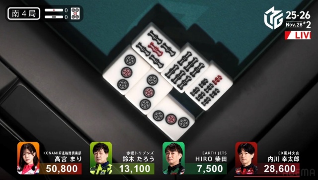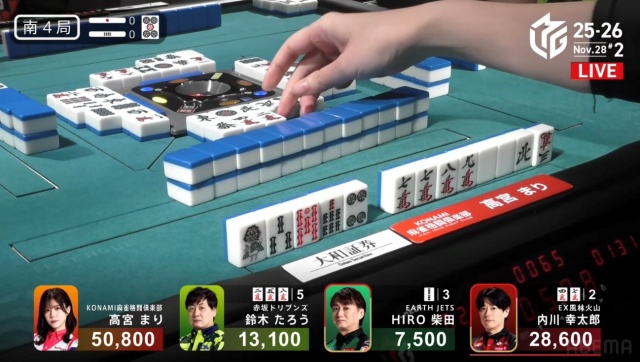 高宮が1,300点でたろうの親を流し、トップは目前だ。