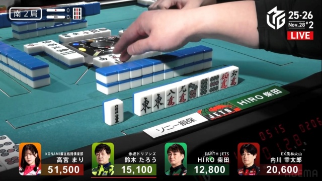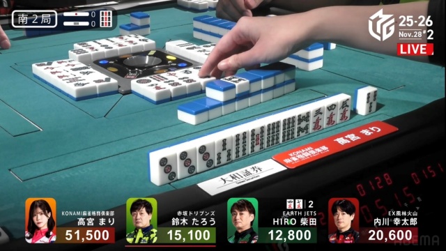 テンパイ一番乗りは最後に仕掛けたHIRO柴田で、絶好のリャンメンである。