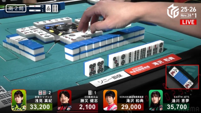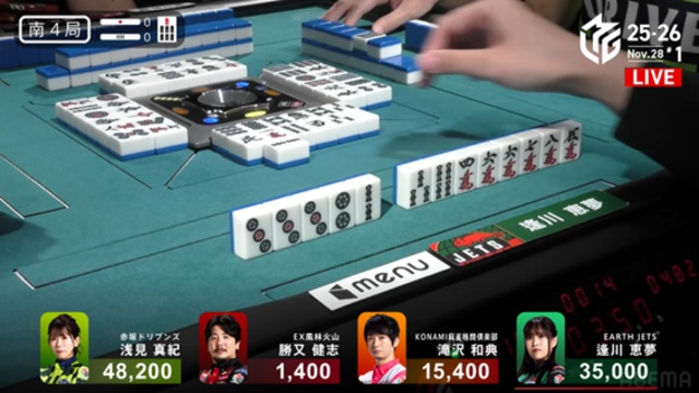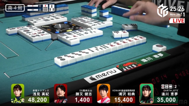これをしっかりとツモり、起死回生の4000オールを決めたのだ。これで再び逢川がトップ目に立つ。