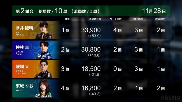 しかし、実際の平均打点は3,730点。これまでのMリーグ平均打点6,600点前後と比べると、実は驚くほど静かでコンパクトな一戦だった。