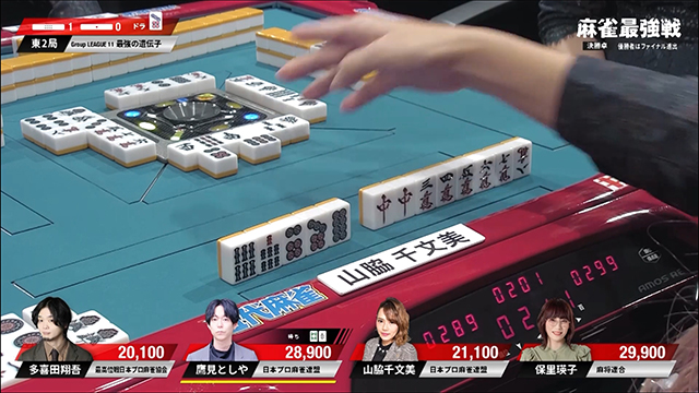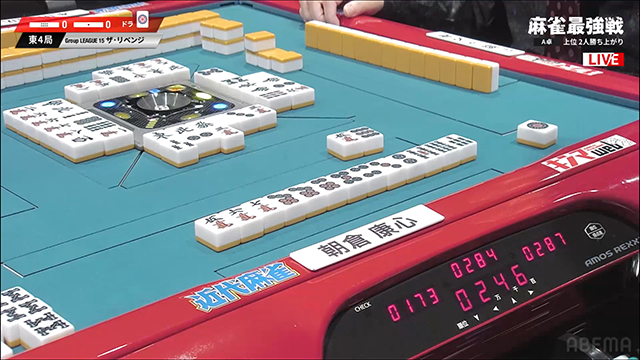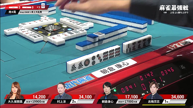 東場はまさに鍔迫り合いをしているような、一進一退の攻防が続いていたが、朝倉が東4局にマンガンをツモアガってトップ目に立つ。