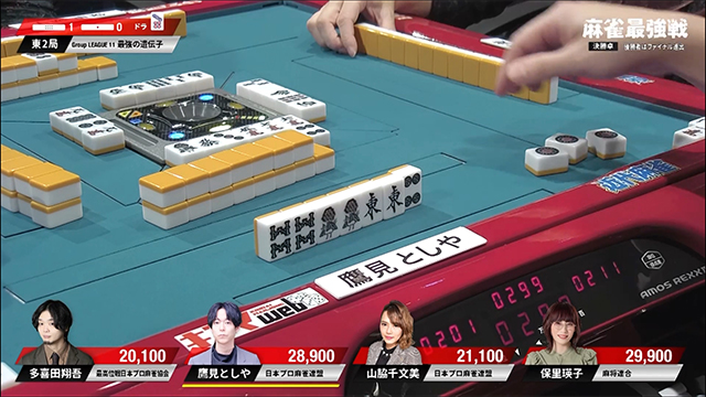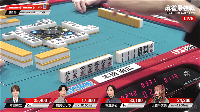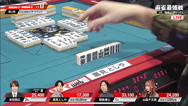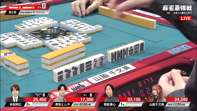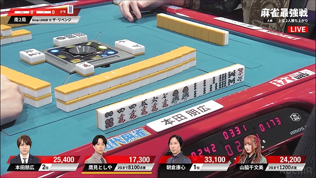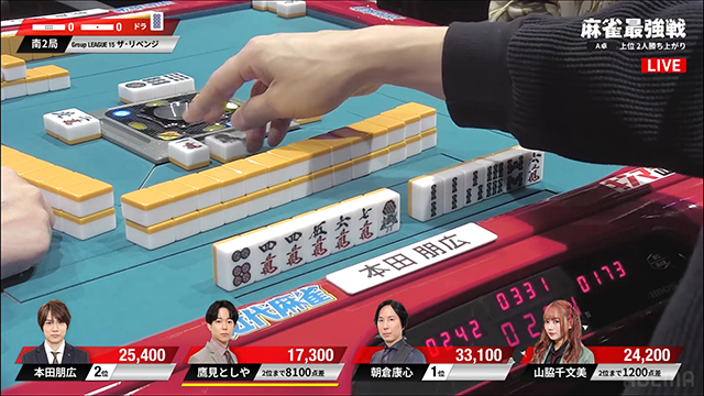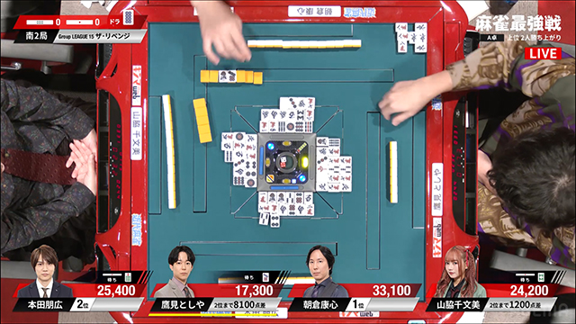 本田・山脇どちらかのアガリでこの親が落ちれば、ラス目の鷹見はかなり苦しい展開を強いられる。逆に、供託2本を回収しながらアガることが出来れば、ほぼ本田・山脇と並び、親が落ちても勝機がある。もちろん、打点はあればあるだけ良い状況。