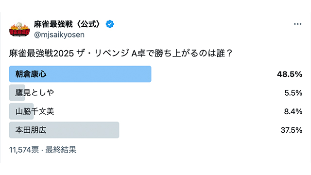 事実、毎予選行われる勝利予想では、現役Mリーガー・本田朋広を差し置いて堂々の一位となった。