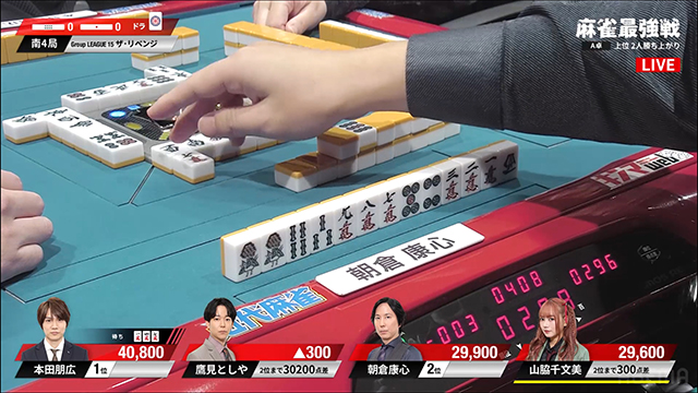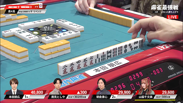 朝倉から本田への、痛恨の1000点放銃で、麻雀最強戦2025ザ・リベンジ 予選A卓の勝者は、本田朋広プロと山脇千文美プロとなった。