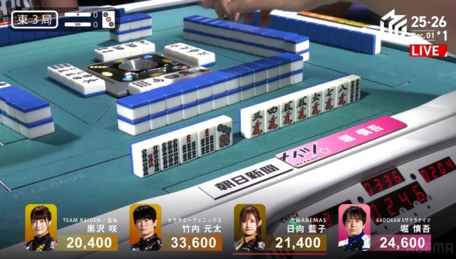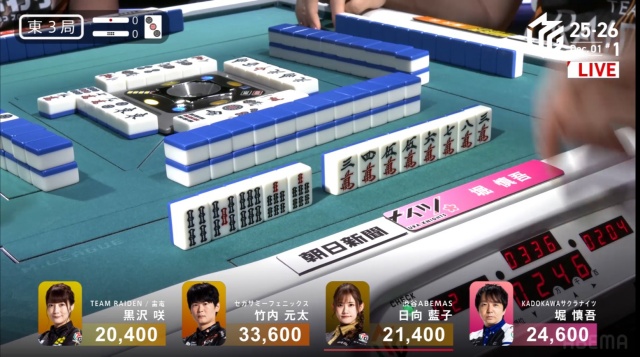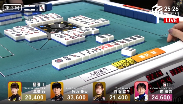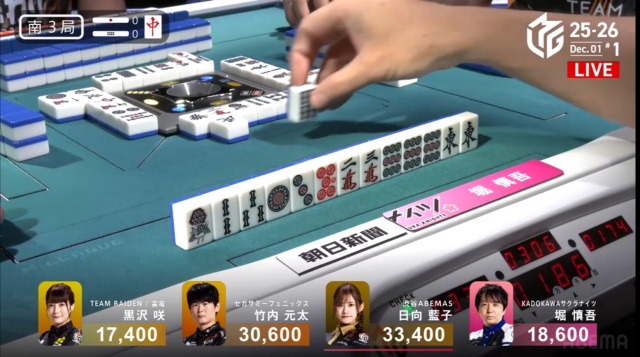 黒沢が放銃に回ったため3着目にはなっているが、この手をチャンタ三色の2000点にはしない。