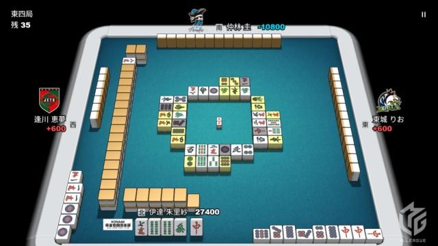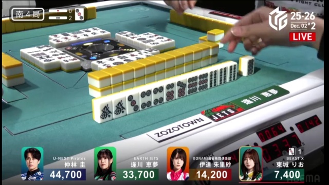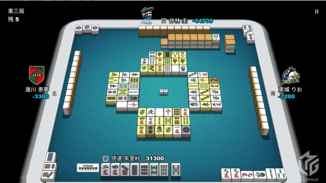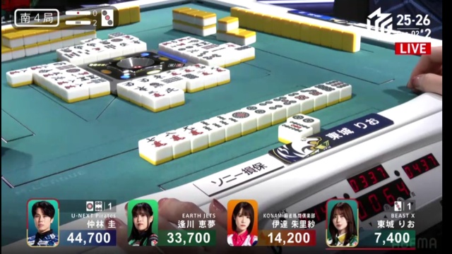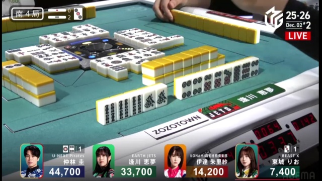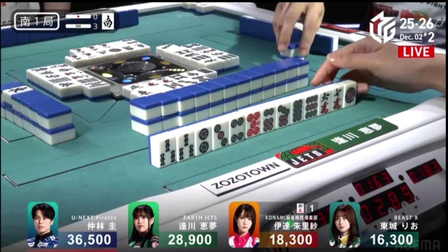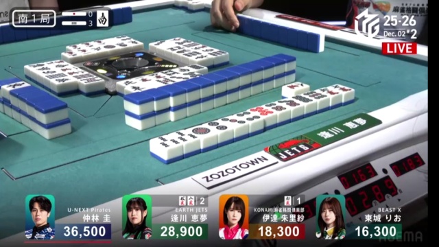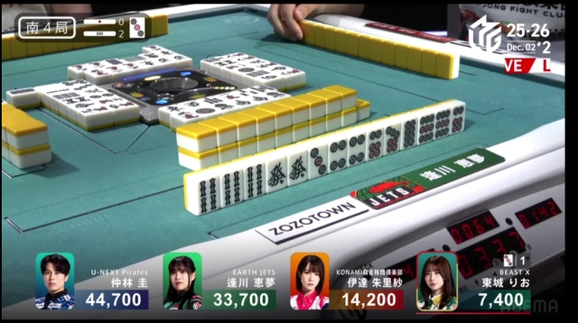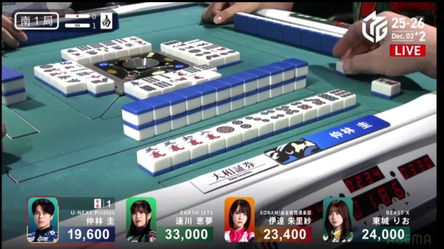 リーチ・一通・ドラ=12000は12600点の、痛恨の放銃。難しい押し引きだったが、トップが見えるなら勝負する手もあるだろう。親の満貫を振ってもまだギリギリ2着目という点棒状況もあったか。