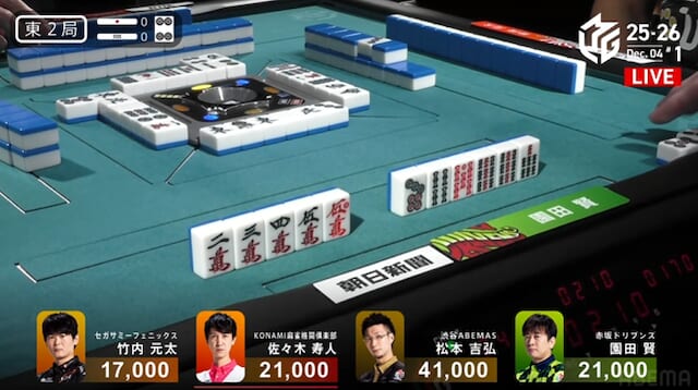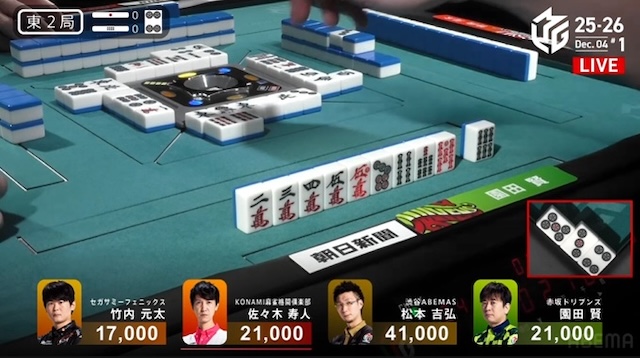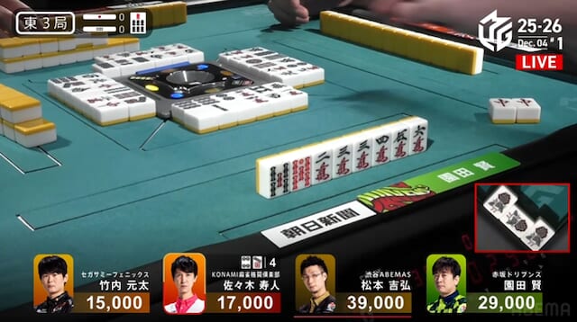 タンヤオ・赤2・ドラの8000点。自在な仕掛けと柔軟な構成力で園田らしさが光った一局となった。