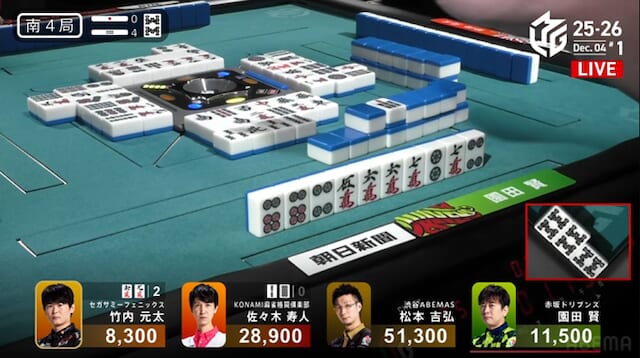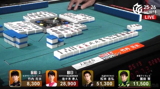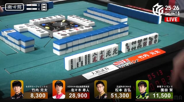 をツモってリーチ・ツモ・ピンフ・裏ドラの1300-2600。 このアガリで3着に浮上。今日は終始後手を踏み、防戦一方。先手を取っても実らず、苦しい展開が続いた元太。だが、その我慢が最終ツモで報われた。