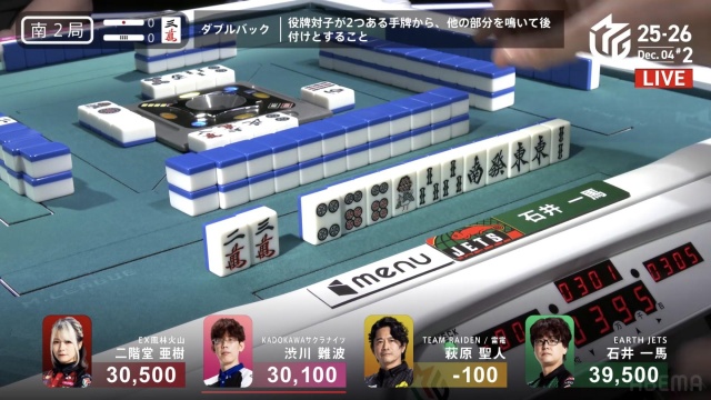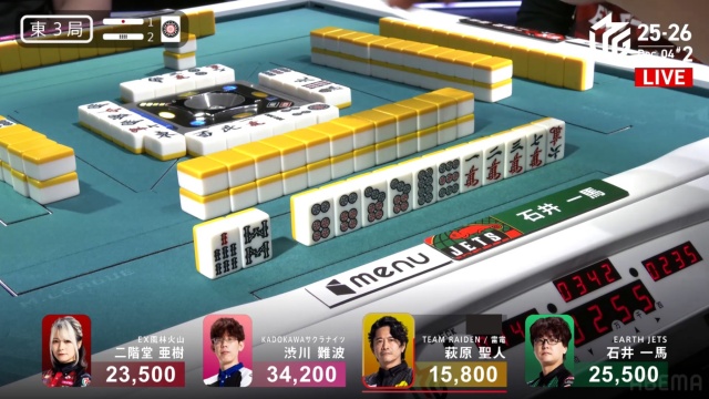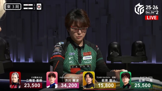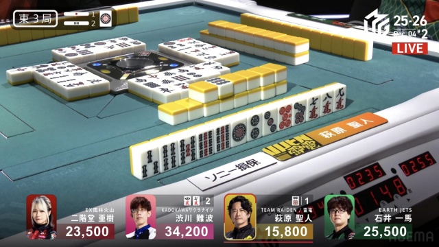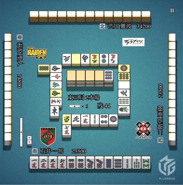 仕掛けた渋川が、タンヤオ赤、2000は2600を萩原からアガってかわす、という結果になった。