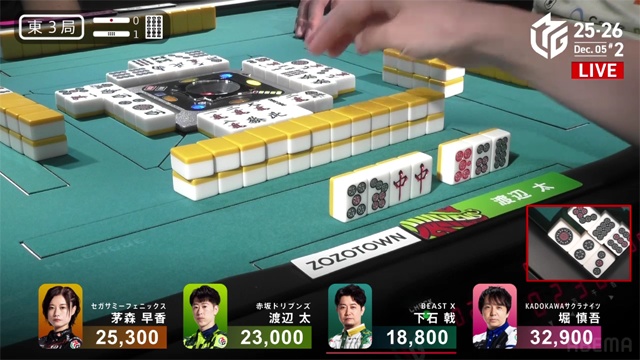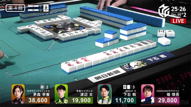 ドラ赤、3900のアガリで2着目に浮上、茅森との差を詰める。