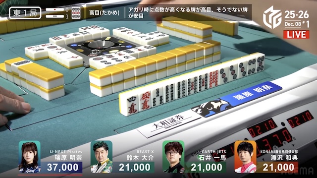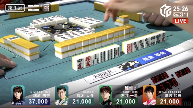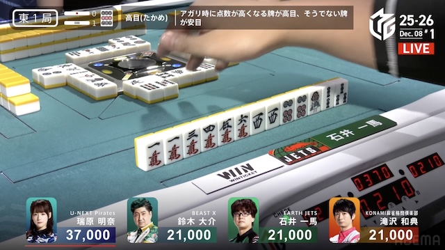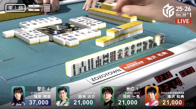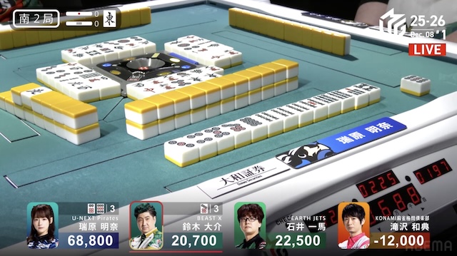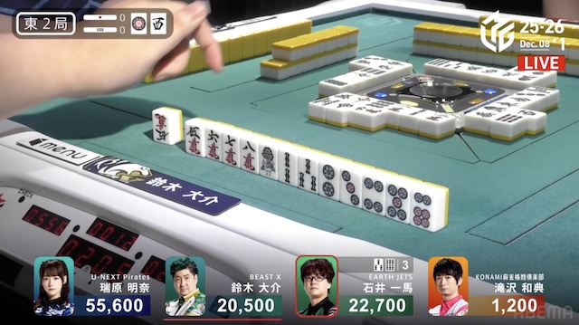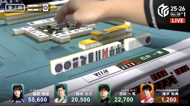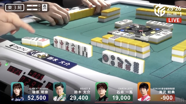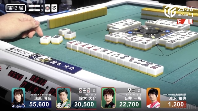 そこでタンピン赤赤のヤミテンを張っていた瑞原が、「滝沢さんが来るんだったら私も行きますよ」みたいな感じで追っかけたら、やっぱり滝沢がつかんじゃうんですよね。つかんじゃうのは偶然なんだけど、ここでの18000は18300、というのはすごいアガリでしたよ。