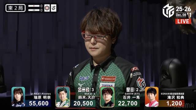 これも結果論なんだけど、一馬がつかんで、最悪の裏裏。この局、一馬はハネ満以上をツモりに行ったんだと思うんですよ、チーム状況を考えて。でもまだ半分も終わっていないと考えると、2着を狙ってポイントを稼いだときに瑞原をまくれるポジションになっていたらトップを狙いに行けばいい、と僕は考えちゃうので、あの手を8000ではなく12000以上でアガりに行ったのが一馬のフォームだったらいいんだけど、チーム状況を考えてのリーチだったら、ちょっともったいなかったなと思いました。