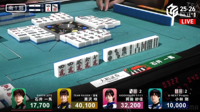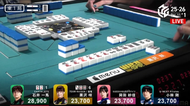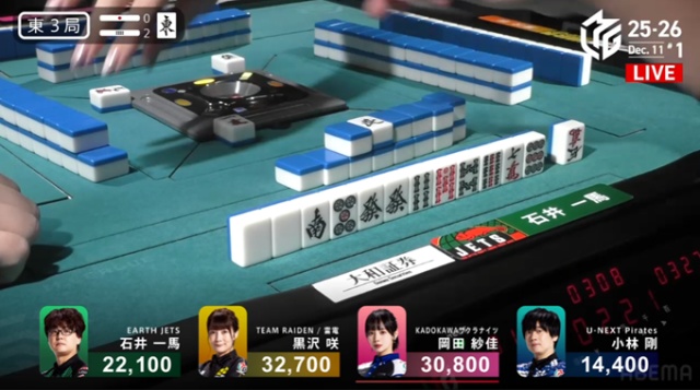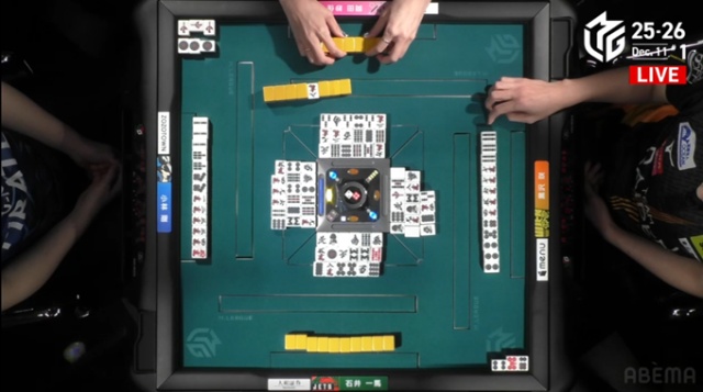 そして終盤、粘っていた親の一馬がテンパイし、リーチを宣言。打点はないが、親番でのテンパイは大きな意味を持つ。場は一気に緊張感を増す。