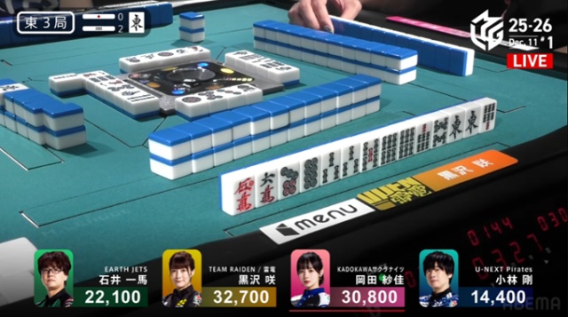しかし黒沢が6枚山に眠る好形三面張を一発でツモ。 リーチ・ツモ・一発・赤・ドラ・裏の3000-6000。 打点のあるリーチをツモり、裏ドラまで絡めてさらに加点する。 黒沢らしい一撃が序盤から炸裂した。