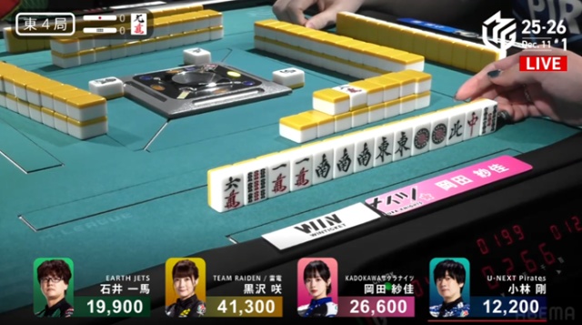 東3局は、小林が先にテンパイを入れたが、岡田が追いつき2000オール。続く1本場でも、やはり小林が先制テンパイ。だが、岡田はそのテンパイに怯まず、押し返してのアガリ。小林から3900を直撃し、さらに加点に成功した。