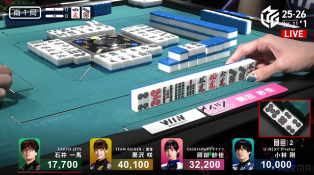 が切れず、ここで降りを選択して結果は流局。先制した跳満テンパイは実らず、岡田にとっては悔しい局となった。