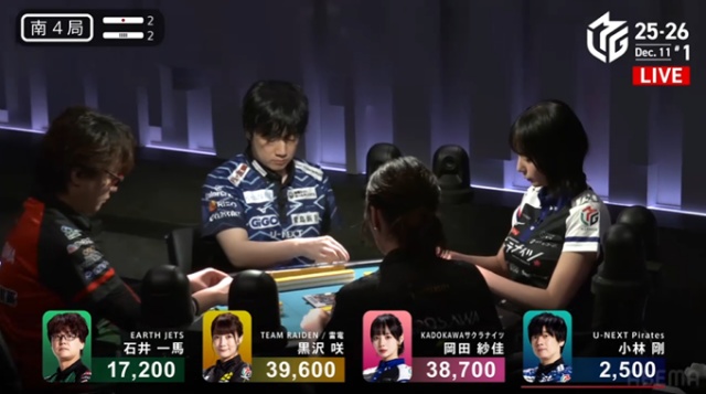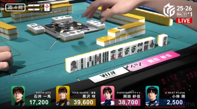 南2局、3局と流局を挟み、迎えた南4局2本場。いよいよオーラス。トップの黒沢と2着の岡田の点差は僅か900点。供託もありアガればトップの状況。