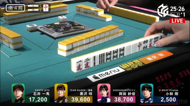 を力強くツモ。リーチ・ツモ・赤・ドラ2の2000-4000。黒沢の一撃がまたも炸裂した。