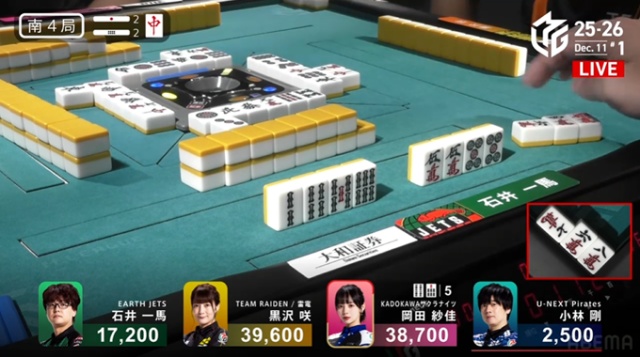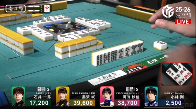 石井一馬は、後手に回る局面が目立ったが、その中でも粘り強くテンパイを重ねる姿勢はさすが。個人スコア2位の実力を随所に感じさせた。
