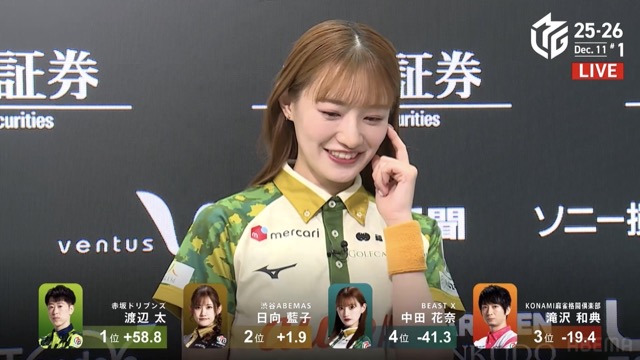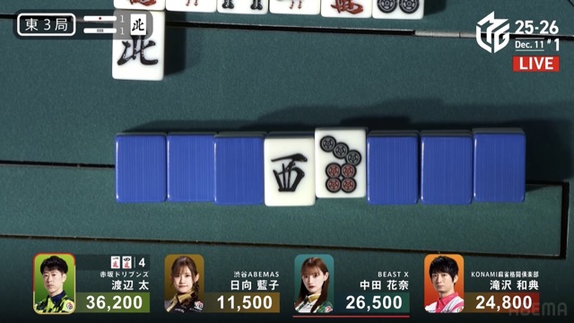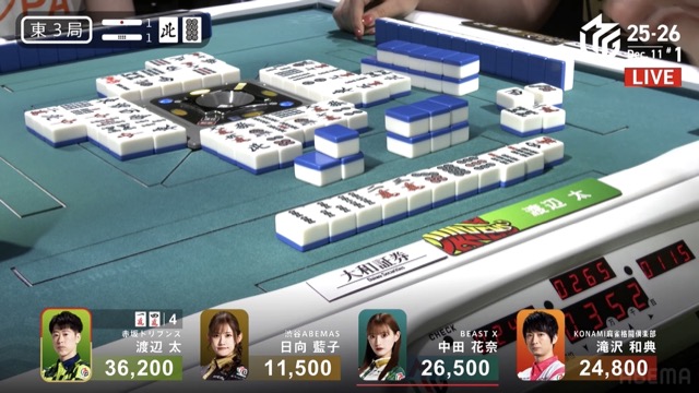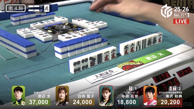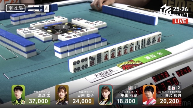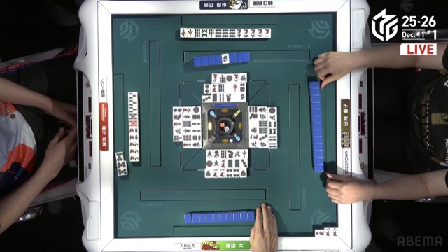 放銃なら1,300で終わっていたが、結果的に中田は親被りで4,000点の失点となった。