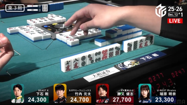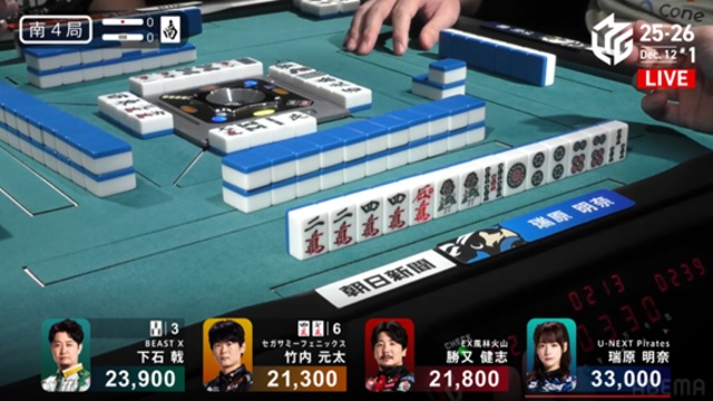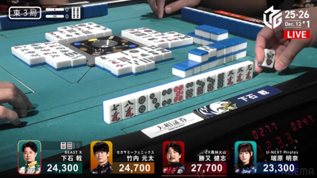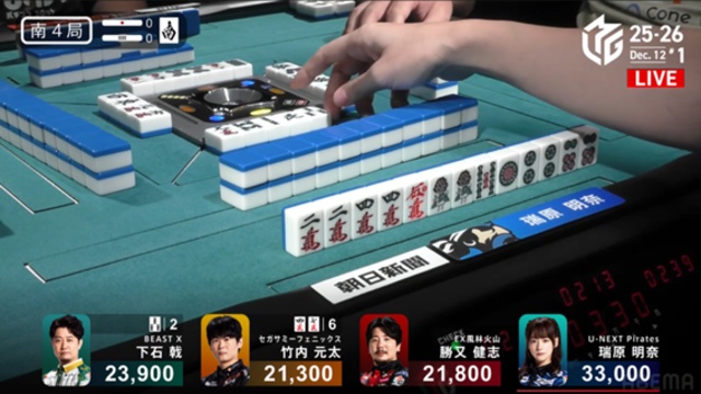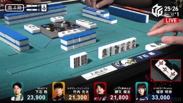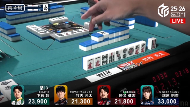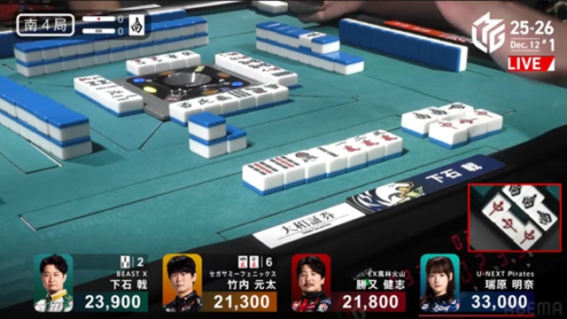 アガった下石はトップ目に、放銃した瑞原は一気にラス目に落ちる痛恨の1打となった。瑞原目線では、トップ目の順位点+50を失った上に、4着目の順位点-30、さらには素点の-12と、点棒換算すると-92,000点の価値がある、あまりにも重い放銃となってしまった。