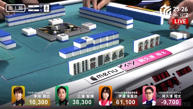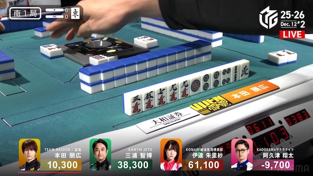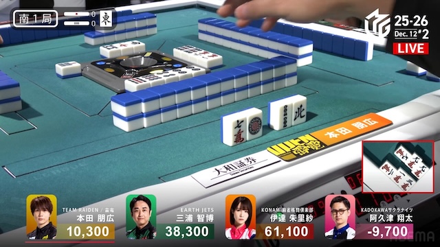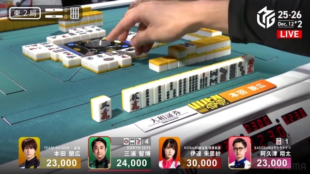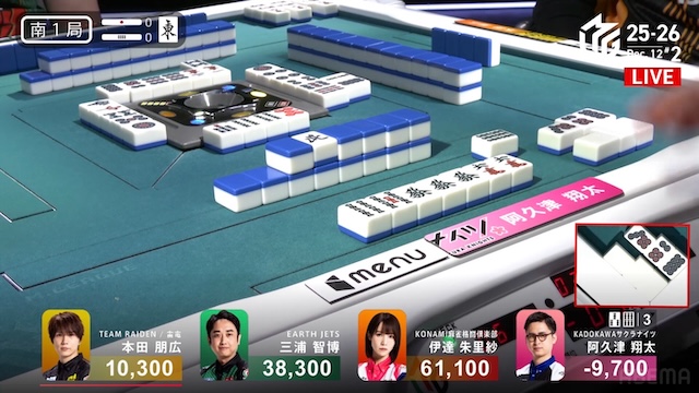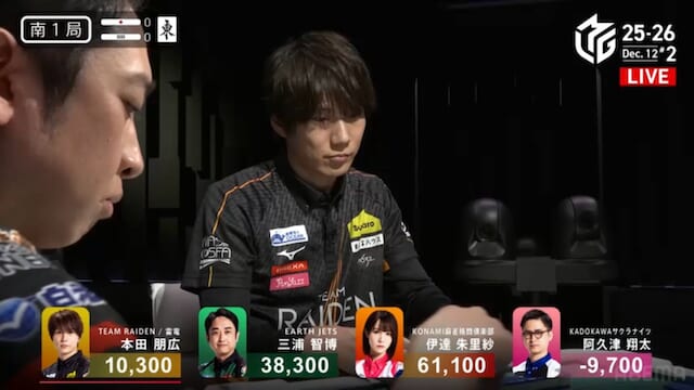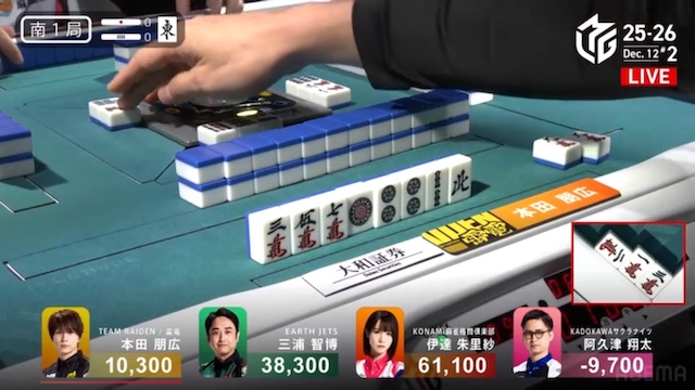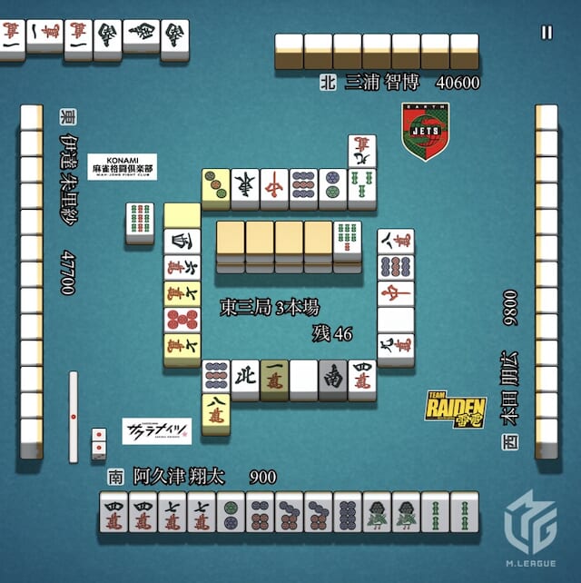 この局は、阿久津が三浦から2,600点の出アガリ。