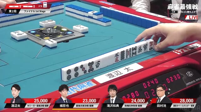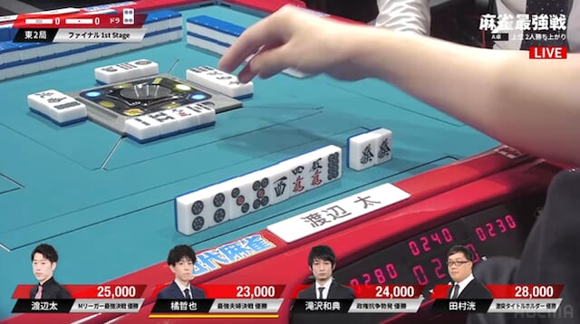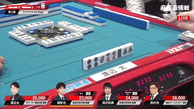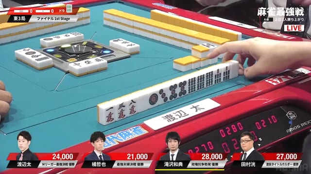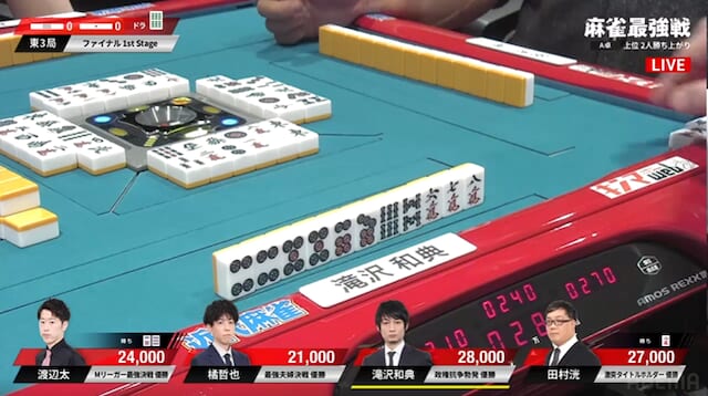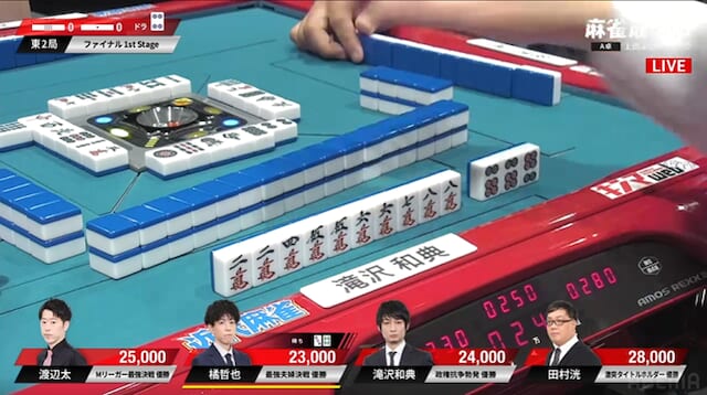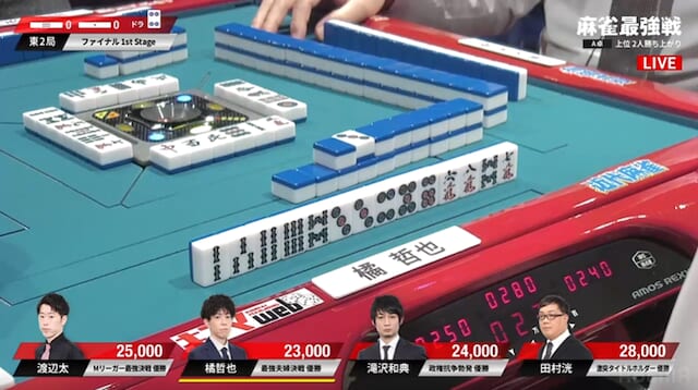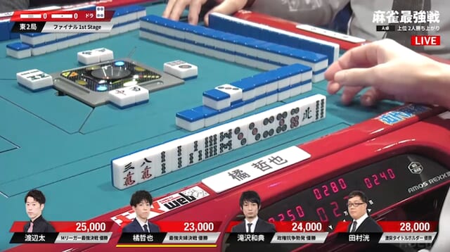 またしてもチャンス手をものにできず、親番を落とす形となった橘。 しかし、太のチーがなければ一発で5200の放銃となっていた場面。 結果的には、最悪の事態を免れたとも言えるかもしれない。