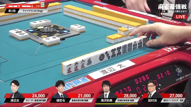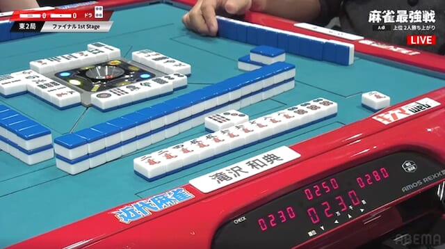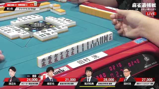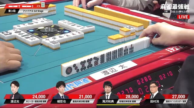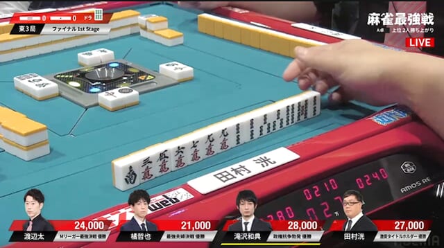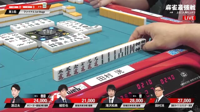 も暗刻に。 ドラに続いての重なりで、一気に勝負手の様相を帯びてくる。 田村・滝沢の