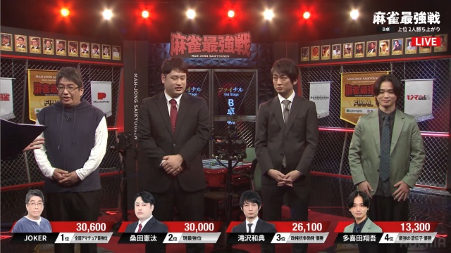 その模様はAbema麻雀チャンネルにて生配信され、B卓からは全国アマチュア最強位のJOKERさん・桑田憲汰プロが勝ち上がった。また1位勝ち上がりを決めたJOKERさんにはJA山形より、つや姫5kgが贈られた。
